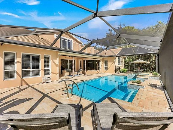 On the Sunny Side of Life ~ Tucked at the end of a quiet cul-de-sac, this residence offers the rare combination of privacy, space, and a premier southern orientation. Nestled on a generous half-acre with 185 feet of frontage against a backdrop of lush tropical foliage, the home lives like a tranquil retreat designed for both relaxation and entertaining. Inside, the light-filled four-bedroom-plus-den/office floor plan flows seamlessly, anchored by a spacious island kitchen with wood flooring, custom wood cabinetry, stainless steel appliances, and ample pantry space. Remodeled baths and a redesigned laundry room feature granite-topped, soft-close cabinetry elevating everyday living, while a gas fireplace adds warmth to the family room. Outdoors, the 33-foot lap pool and spa command attention, fully renovated and surrounded by an expansive new sun-soaked deck and panoramic-view lanai enclosure—ideal for morning swims or relaxed evenings under the stars. Practicality pairs with peace of mind through abundant storage, a full three-car garage, and recent updates such as a new roof, whole-house impact-rated storm protection, and a renovated upper balcony. At an enviable 11.3 ft elevation, this home is perfectly suited for the Southwest Florida lifestyle. Located in the prestigious Audubon Sanctuary Club of Collier's Reserve where world-class golf and active tennis and pickleball programs are coupled with premium amenities, multiple dining options, and a passion for environmental stewardship.