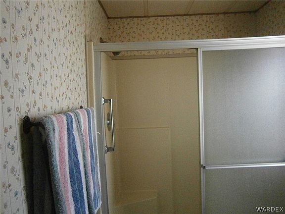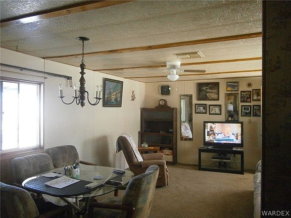 The home is on a double lot with an exceptional view of desert and mountains(approx. 250 degrees of view into BLM land .The home has two large carports/patios on slabs with wooden covers with rolled roofing .The house has shingle roof .Yard is landscaped with irrigation .Fire pit in the yard .the kitchen is open to lv rm. and dining area .The home has a stone fence that forms a planter from front to rear of propery.4 minutes from stores and restaurants .Topock sch .dist. (File #4000)