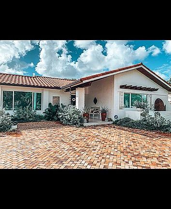 Dock for kayakDade county pine beamsItalian quartz countertopsSpanish stuccoOpen conceptPlayroom for kidsHandmade roof tiles
