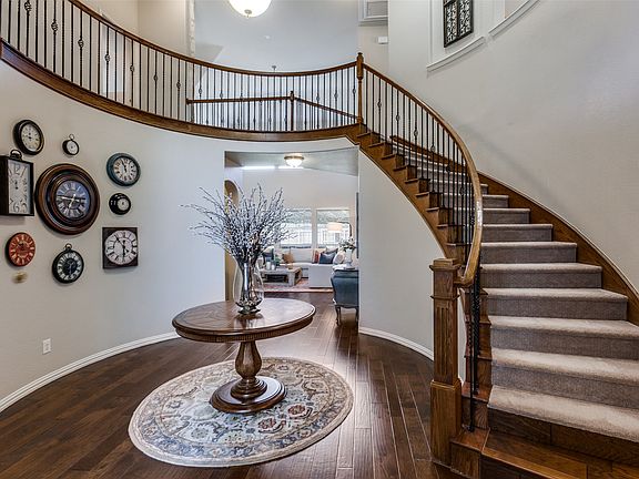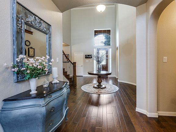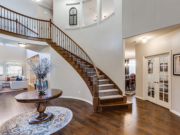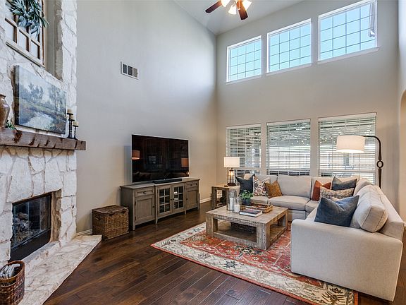 Beautiful Landon stone elevation home in peaceful Villages at Willow Bay neighborhood. Perfect for entertaining, featuring ample indoor & outdoor spaces. Interior has an abundance of windows, providing excellent natural light along with beautiful engineered wood flooring. Impressive foyer with curved staircase for fabulous photo opportunities. Family room boasts high ceilings, cozy stone fireplace, soaring windows to the backyard. Open-concept kitchen is a chef's delight, offering generous countertop space, high-quality red-oak cabinets with pull-out drawers, breakfast bar, gas cooktop & large walk-in pantry. Study ensures privacy with French doors & a closet for office supplies. Large primary bedroom sitting area & serene views of the backyard with walk-out to the covered patio. Its ensuite bathroom features a large shower, a relaxing bathtub, high vanities with ample countertop space, make-up vanity & a huge walk-in closet. 1st floor guest bedroom offers a private ensuite bathroom with shower & walk-in closet. Spacious secondary bedrooms with ample walk-in closet space. Jack & Jill bathroom & hall bathroom offer plenty of vanity sink areas. Large Game-room for ping-pong or pool table entertainment. Media room movie night with bump-up seating & wired for projector & speakers. Oversized laundry room with upper cabinets, freezer-fridge space & natural light. Convenient half-bath for guests. Texas-sized covered outdoor living area is ideal for watching TV & barbecuing your favorite meals, open to large backyard. 3-car tandem garage. 2025-Carpet, 2024-Keyless door entry, 2024-Interior paint, 2022-2023 AC coils, 2022-Gas cooktop, MW & stone edging, 2021-Water heater, 2020-Roof Impact Resistant Shingles, 2019-GE dishwasher, 2017-Genie cabinet drawers, Flagstone patio & pergola, 2016-BoB fence, driveway electric gate, garage door opener, 2015-Hardwood floors. Walking distance to schools. Community pools, splash pad & hike & bike. Close to UNT, PGA & Universal Studios.