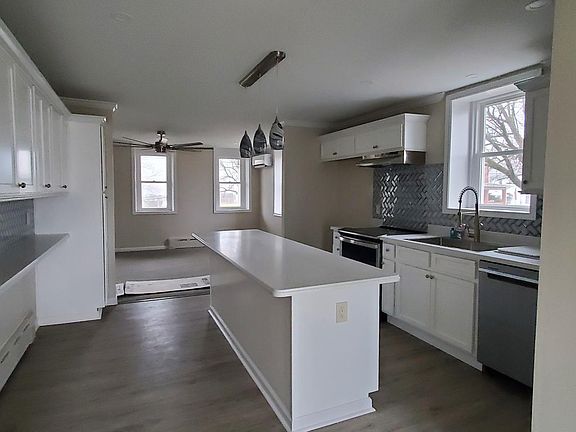 Beautifully rennovated half double. Totally re-done. Enter via you large deck into sitting room w/laundry, Kitchen with new range, dishwasher, center island & counter seating, Living room. On 2nd floor you find 3 bedrooms and full bath with modern stand up shower. The 3rd level has bedroom. There is additional full bathroom in the basement area. New oil cast iron baseboard heat. New mini-splits for air conditioning or supplemental heat. This home is absolutely gorgious. There is also a 2 car garage. The home will be having stucco put on outside in spring to match garage. No smoking or vaping in property. Owner may consider a small pet. Tenants pay for all utilities (water, sewer, trash, oil heat, electricity, cable, internet phone and lawn & snow care). First, Last and Sec. deposit will be required.