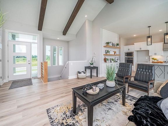 Absolutely spectacular new design by Moeder Construction with over 1500 square feet on the main floor. Presenting the Riverton III design! When you arrive you will love the exterior elevation with hip roof, gorgeous colors, stone, wood accents, windows in the garage doors, unique windows at the large porch and black windows. The design is a split bedroom plan with a large master suite offering double vanities, tile shower, walk in closet that connects to the laundry room. The living room bestows large windows, gorgeous beams and an electric fireplace. In the kitchen you will find tons of cabinets, coffee bar, walk-in pantry, custom bench with cubbies and custom range hood. Relax on the large raised concrete patio! The community gives fabulous amenities such as a clubhouse, swimming pool, pickle ball court, fitness center and dog park! Some information is estimated and cannot be guaranteed. Options and pricing are subject to change without notice. There will be a mailbox fee charged at closing. 2023-09-24