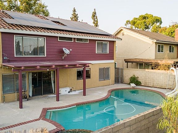 Price Reduced!! Move In Ready Cerritos Pool Home! Don't miss seeing this 4 bedroom, 2.5 bathroom home Plus Bonus Room! Spacious with 2553 square feet of living space, separate formal living room and dining room and lovely kitchen with stainless appliances, granite counters, large island and rich dark wood cabinetry. Kitchen opens to the family room with cozy brick fireplace! Bright with natural light, neutral color scheme, rich wood laminate, tile and plush carpeted floors and more! All bedrooms are upstairs along with a huge bonus room/game room with wet bar! Large Master Suite with beautiful custom tile work and dual shower heads in the step in shower! Out in back you will find a covered patio and of course the refreshing pool and spa for relaxing and entertaining! This awesome home has a newer AC and solar panels for huge savings on utilities! Walking distance to schools, parks, shopping and situated on a quiet cul-de-sac. Everything you need is here!