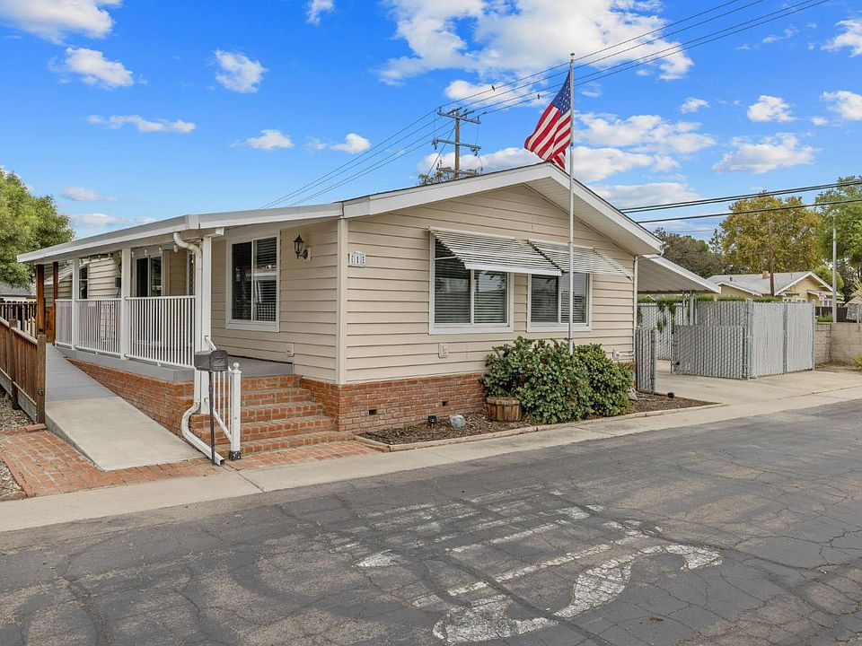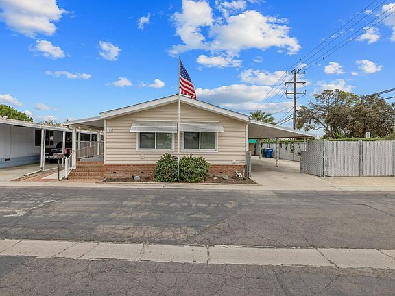 This beautifully remodeled 2-bedroom, 2-bath double-wide manufactured home offers 1,440 sq ft of spacious living. Over the past seven years, it has been thoughtfully updated with dual-pane windows and blinds that invite natural light, a newer comp roof, updated electrical, and a newer water heater. Inside, you'll find plush carpet in the bedrooms and stylish laminate flooring throughout the main living areas. The layout includes a full living room, a cozy family room, and a formal dining room featuring a built-in china cabinet. The kitchen has been modernized with ample cabinetry and newer appliances, all seven years old or less, including an electric cooktop, dishwasher, refrigerator, microwave, washer, and dryer. The master suite is generously sized and includes a spacious bathroom with dual vanities, a large shower, and plenty of storage. Additional storage is found throughout the home, making organization effortless. Outside, enjoy a large, covered patio deck with an ADA ramp, a charming yard, and two storage sheds with one fully equipped with shelves, lighting, and electricity. The covered carport accommodates two vehicles, with extra space available for RV or trailer parking (subject to park approval). The exterior features durable vinyl siding, a beautiful brick perimeter, and privacy fencing, all softly illuminated by country-style lights that create a warm evening ambiance. Located in a welcoming 55+ mobile home community, residents enjoy access to a variety of amenities including a community clubhouse, a sparkling pool and relaxing spa, and a scenic BBQ area with a tranquil pond and grassy space perfect for gatherings or quiet reflection. Guest parking is conveniently nearby, making it easy to entertain friends and family. This home blends comfort, convenience, and charm in a vibrant and friendly neighborhood.