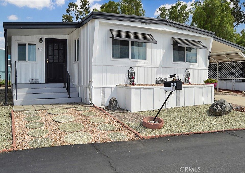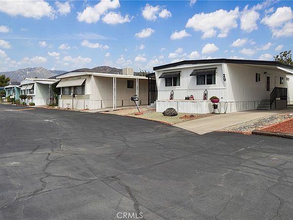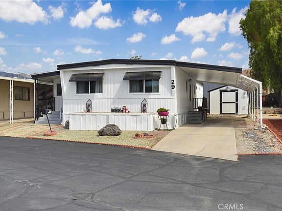Welcome Home to 1255 Amethyst Ave., Space 29 in Carriage Isle Mobile Home Park in Mentone! This 55+ park is off of Hwy 38 near Redlands on the way to Big Bear with views of the mountains and trees but with all of the comforts of the city nearby. This home has been lovingly upgraded over the past 5 years so is move-in ready for the lucky new owner. Check out the photos and virtual tours to see the stylish paint inside and out, fabulous flooring, modern lighting, and attractive black door handles and hardware all combining to create a stylish home you are sure to love! This double-wide home offers a charming entry, spacious living room connected to the dining room and kitchen, 2 bedrooms, 2 baths, and a bonus room perfect for an office, family room, home gym, pet room, or even a spare bedroom. The main bedroom suite has a door leading to the garden out back, an en suite bath with a very generous amount of vanity space, privacy door to the shower and toilet room, and a nice-sized walk-in closet. The 2nd bedroom has a bathroom right across the hall. The kitchen opens to the dining room and includes a free-standing range, refrigerator, and microwave cart (with microwave) included. It's right next to the carport for easy re-stocking after grocery trips. The dining room offers sunset views and has a modernized built-in hutch for added storage. The washer and dryer in the laundry niche by the kitchen are included for your convenience. On those warm summer days, you have the option of using the central AC or the swamp cooler. Dual-paned windows help make it more efficient, too. Outside, the Tuff Shed is the perfect place to keep your tools and complete some projects. The yard offers a raised garden bed and an abundance of potted plants to enjoy. A 2-car tandem covered carport offers private parking. Visitor parking is conveniently located right across the street. The clubhouse, pool, and patio are around the corner. This home is priced to sell, so call or text your favorite agent, then make this beautifully updated house your next home!