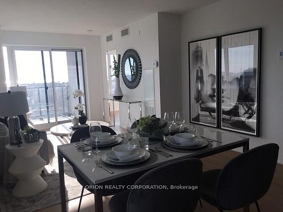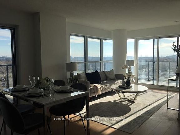 Welcome to this spacious 950 sq. ft. southeast corner unit featuring 2 bedrooms plus a den and 2 full bathrooms. This bright, split-bedroom layout offers laminate wood flooring throughout and large windows with vertical blinds, showcasing breathtaking south-facing views of the ravine and Lake Ontario. Enjoy a large wraparound balcony (note: floor plan may show a terrace) and resort-style amenities, including an outdoor pool with cabanas, hot tub, fully equipped fitness centre, sauna, party room, and 24-hour concierge and security. This elegant building also offers convenient access to highways, the GO Train, and public transit perfect for commuters and urban lifestyles alike.