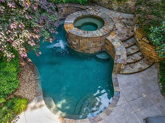 Sparkling pool and spaStone fireplaceRaised hearth fireplaceWeeping mortar brickHardwood floorsPark-like backyard oasisOpen loft space