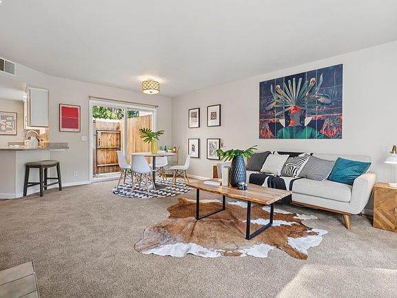 Easy living awaits in this spacious 2BD/2BA contemporary townhome close to all the wonderful amenities in Concord’s Monument Corridor. With towering redwoods overhead, the 1152 SQFT home looks onto a green park area with a neighborly patio and level lawn to relax or play. Step inside the gate to find your own private patio where you can entertain, dine al fresco, or lounge in the sun. The townhome’s living area enjoys an open floorplan with sliding glass doors to the patio for wonderful indoor/outdoor living. Off the kitchen and dining area, a second set of sliding glass doors opens to another fenced patio. The kitchen features newer appliances, plenty of storage, and convenient interior access to the one-car garage. There is also a second deeded parking space right in front. A skylight streams sunshine onto the stairwell leading to the bedrooms, located upstairs for quiet and privacy. Cathedral ceilings and another skylight make the primary suite light and airy with its walk-in closet and ensuite bathroom. Down a hallway find a laundry area, a full bath, and another bright bedroom. Out your front door, enjoy every amenity including shopping, dining, gyms, Costco, down the road to schools and local parks plus BART and convenient commute options are nearby.