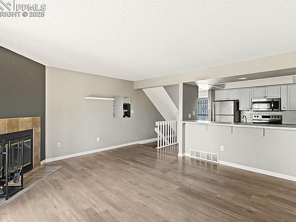 This beautifully updated 2 bedroom, 3 bath, 1 car attached garage townhome is ideally situated in central Colorado Springs, offering convenient access to shopping, schools, and nearby military installations. The main level features elegant laminate flooring, a convenient half bath just off the entryway, and an open-concept kitchen, dining, and living area. The kitchen includes sleek white cabinetry, light countertops, stainless steel appliances, a classic white subway tile backsplash, and a bar top that opens to the living and dining spaces. The living room includes a wood-burning fireplace with tile surround, creating a comfortable space for cooler evenings. A wood deck off the main level provides a peaceful view of the wooded open space behind the home. Upstairs, there are two spacious bedrooms, a full bath with an updated vanity and a tub/shower combo with tile surround. The finished basement offers additional living space, including a half bath, laundry area, and a large recreation room or non-conforming bedroom. Additional features include air conditioning and a prime location with nearby amenities. This well-maintained townhome offers a combination of style, comfort, and convenience.