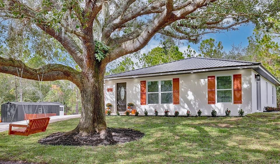 Experience this fully renovated 5-acre, country retreat, located in the sought-after Lake Harney Estates of Geneva. This home is zoned for A-rated Seminole County Schools, offering a rare combination of private, country living and top-tier educational opportunities. The interior has been meticulously updated with an intentional farmhouse aesthetic that is warm and cozy, yet neutral enough for new owners to imprint their own style and make it uniquely theirs. This split floor plan offers 4-bedrooms, 2-baths, and an additional office/bonus room with a new sliding door that provides a tranquil view of the property--perfect for focus (or daydreaming). Renovation Highlights: New HVAC, windows and doors, updated plumbing and electrical, tankless water heater (2025), water-filtration system (2025), 25-yr+ metal roof (2025), LVP flooring (2025), and new washer/dryer. Kitchen - Real wood, soft-close cabinets, and all new GE appliances. The pantry has been expanded and boasts custom shelving. Primary en suite bathroom - Walk-in closet, jack/jill vanity, and double shower stall Exterior - A new, versatile 12x20 detached 1-car shop and a practical 8x12 storage shed flank the hardscape patio, anchored by a built-in firepit for evening gatherings. And for quiet moments, a classic swing hangs from the grand oak tree out front, perfectly positioned for watching spectacular western sunsets. This property combines the peace and potential of country living with the confidence of a comprehensive, no-project-needed renovation. It’s more than a house; it’s a turn-key homestead ready for the next chapter. Not to mention the A-rated school system Schedule an appointment to experience 1255 Flint Trail for yourself.