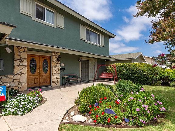All aboard! A stamped concrete driveway and walk way lead you to this popular Heather Glen 4 bedroom, 2.5 bath home in central Camarillo! With over 2400 square feet of living space, the home features a formal living and dining room, a gourmet eat in kitchen with quartz counters and an adjoining family room with fire place. Convenient indoor laundry and tons of storage space throughout. The four bedrooms are upstairs and include a spacious master suite with an ample walk-in closet and an updated bathroom with granite vanity and tiled shower. The backyard is in the spotlight with a spectacular garden railroad, a fun hobby for all ages! There is also a huge covered patio, fire pit, grassy area, Fuji apple tree, Cherimoya tree, garden area, above ground spa, and covered parking area. Check out the attached list for specs and details on the garden railroad, included in the sale. Lots of room to relax and enjoy!