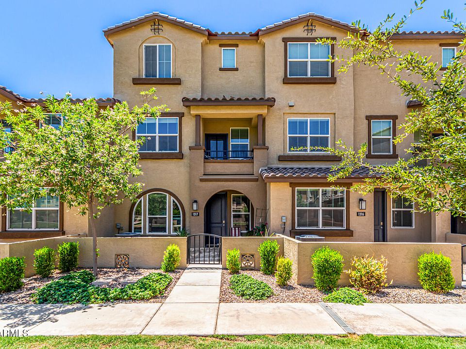 Gorgeous tri-level townhome in the gated Tre Vicino Condominium! Offering 4 beds, 3.5 baths, & a rear 2-car garage. The fenced-in front porch is just the beginning. The fabulous interior features tons of natural light, designer paint, recessed lighting, and carpet & wood-look tile flooring t/out. On the ground level, you'll find a guest bedroom with a private bathroom. Discover the 2nd/main floor that features a seamlessly flowing open layout! The impressive kitchen has SS appliances, quartz counters, staggered shaker cabinetry, a walk-in pantry, & an island w/breakfast bar. The top-level offers three bedrooms! That includes the primary bedroom, boasting an ensuite with dual sinks, a walk-in closet, & a sit-down shower w/dry-off area. If you want to relax, the balcony awaits! Tre Vicino residents enjoy resort-style amenities, including a sparkling pool, lush greenbelts, and picnic areas. PLUS! Convenient access to Downtown Chandler's vibrant dining, shopping, and entertainment scene. What's not to like? Make this gem yours!