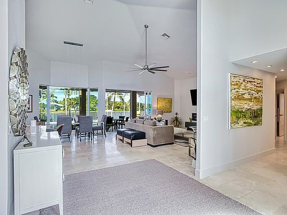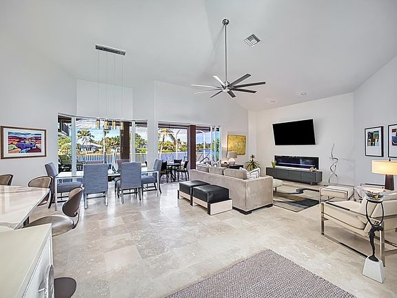 Sweeping water views will greet you when you walk into this spectacular island home. This sophisticated, contemporary home has been completely renovated with high-end finishes throughout. The popular great room design features vaulted ceilings, an electric fireplace, a peninsula breakfast bar, large dining area and a dream kitchen. Living and entertaining areas in the great room flow out to an oversized lanai where you and your guests will experience calm and relaxation while enjoying the peaceful, expansive water views. Enjoy swimming in the free form pool or soaking in the hot tub. The spacious primary ensuite boasts a sitting area, a walk-in closet/ dressing room, dual vanities and a garden soaking tub. Split bedroom design affords privacy for all. There is abundant storage throughout the home- even a bonus flex room off the laundry for additional storage, or it could serve as a craft room, an artist’s studio or an exercise area. Partially elevated, this home also features impact glass. The two car+ garage has room for both cars, a golf cart and bicycles. An EV charging station is already in place. Located in the popular Dunes neighborhood, this east end location is close to the beach, the bay and offers easy on/off access to the island. If you are looking for a “WOW” factor, you need to see this home.