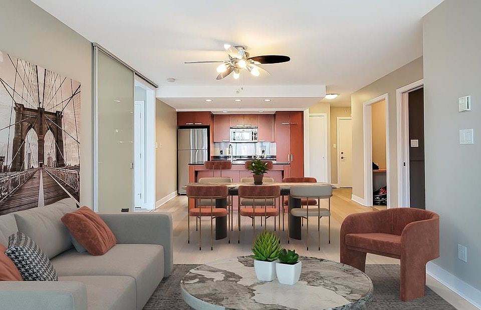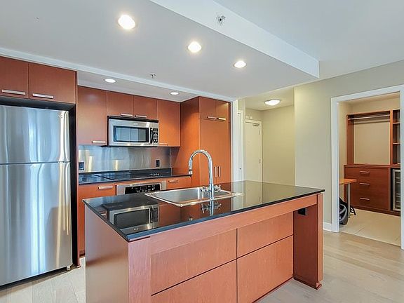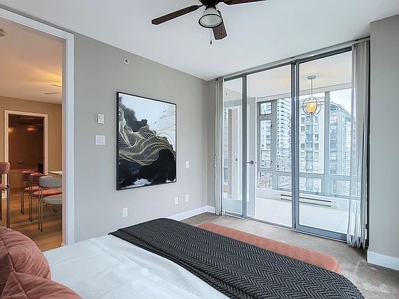 Great floorplan with two bedrooms on opposite sides of the suite with two four piece bathrooms. Elan is located in Downtown Vancouver and a quick walk to the Seawall, Aquabus and Granville Island. A few blocks to the North and your on Robson St. with all the shopping and restaurants for your convenience. Eight minute walk to Canada Line and Yaletown. Suite has insuite storage as well as a locker in the parking garage. Building has a large gym, sauna/steam, games room. Cats and dogs are welcome. One parking stall in a secure underground garage. An ample den with wrap around windows on two sides.