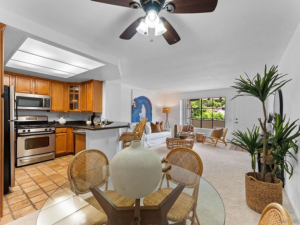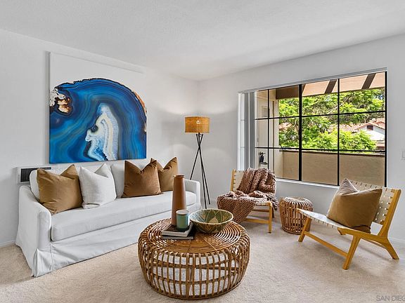 This 2-bedroom, 2-bathroom top-floor condominium offers 864 square feet of comfortable living with abundant natural light. The open layout is enhanced by fresh paint, new carpet, and a covered outdoor porch perfect for relaxing or entertaining. The community features resort-style amenities including a tennis court, clubhouse, pool, jacuzzi, and sauna. Residents enjoy a family-friendly yet professional atmosphere, with the added benefit of convenient freeway access, proximity to shopping and dining, and just minutes from the beach. Located within the highly regarded Del Mar School District, this home presents an exceptional value in a sought-after location.