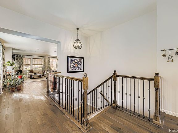 Welcome to this beautifully updated Flatirons model in the highly desirable Skyestone 55+ community. A stained-glass front door opens to a warm and inviting main level with wood flooring throughout. The office features new carpeting and a stylish barn door for privacy. The great room showcases a modern linear fireplace with added mantel. Basement stairs are accented by wrought iron balusters and new upgraded carpeting. The kitchen offers light grey cabinetry, quartz countertops, gas cooktop, and a large island with seating.