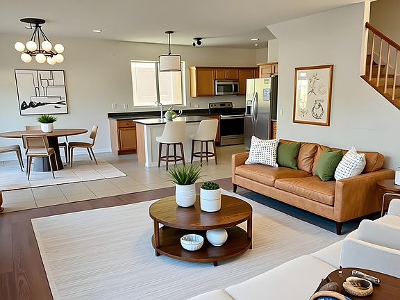 Open kitchenLarge loftFormal dining areaFront flex roomDownstairs bedroom and bathPeaceful greenbelt