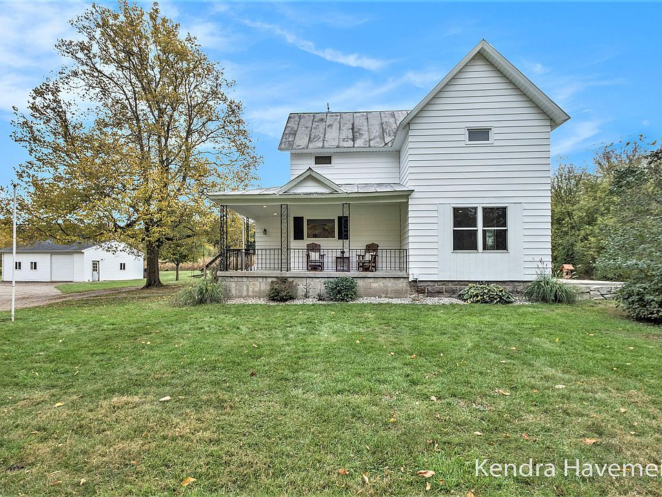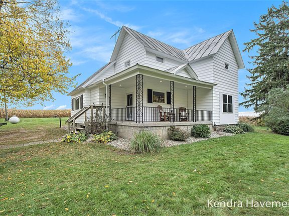 This charming 1902 farmhouse sits on 1 acre of peaceful countryside and has been thoughtfully updated while preserving its character and warmth. Surrounded by farmland and mature trees, the setting offers privacy, wide-open sky views, and beautiful sunsets year-round. A spacious covered porch welcomes you into a large foyer/mudroom with plenty of room for storage. The main floor offers a generous kitchen and dining area, a cozy living room overlooking the property, a full bath, and a large laundry room. Upstairs you'll find three bedrooms plus a flexible bonus room that can serve as storage, an office, or hobby space. Recent improvements include updated mechanicals, newer windows and doors, a newer cement patio, and more. A full Michigan basement adds storage, and the outbuilding/garage offers power and a wood stove. Whether enjoying quiet mornings on the porch or evenings around the fire pit, enjoy a serene rural lifestyle with easy access to town.