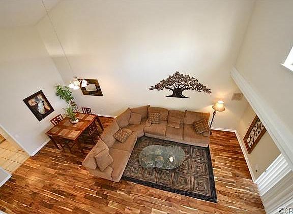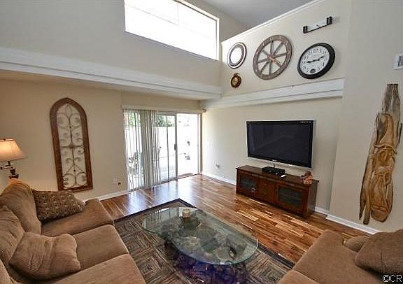 Gorgeous North Hills home receives plenty of natural sunlight through 2 sets of south-facing sliding glass doors and high windows. This home is truly special with custom hardwood flooring & staircase created by the Seller who is a skilled craftsman. Located at the end of a cul-de-sac, it features a great mountain view from the rooftop deck, granite kitchen & bathroom counter tops, loft, and a main floor master suite! Gated garden entryway with glass block accent. This home offers 3 outdoor settings: the front patio, wide side yard, and paved patio area in the back. Soaring 2-story vaulted ceiling over the formal living & dining room. Tastefully updated kitchen opens to tiled area perfect for informal dining or family room with access to the front patio via a sliding glass door. The kitchen has a breakfast bar, pendant lighting & plenty of cabinetry. Spacious main floor master suite also has a sliding glass door to the patio. Custom, unique wood staircase leads to 2 more bedrooms, full bathroom, and an airy loft with a lush greenbelt view! Expansive side yard with plenty of room to run - great for outdoor parties. 2 car attached garage. Located near the pool and spa. Convenient to parks, shops & restaurants. HOA includes water and trash also.