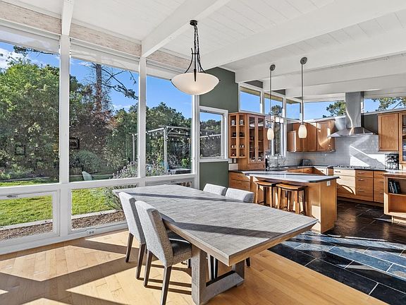 Clean lines and expansive windows create a strong connection to nature, filling the interior with natural light and framing serene garden views. Vaulted beamed ceilings and warm wood details enhance the open-concept living and dining space, which flows into a thoughtfully updated kitchen featuring custom cabinetry, quartz counters, and premium stainless appliances.