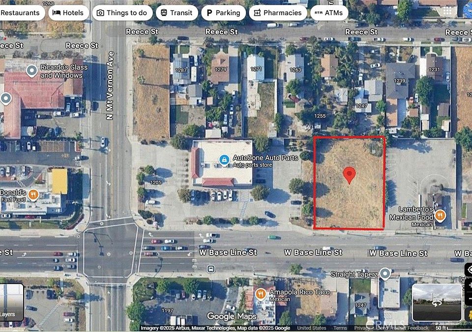 Prime 0.41-acre unimproved commercial parcel with two curb cuts and strong Baseline St. frontage in the heart of San Bernardino. Zoned CG-1 Ready for development or hold for future appreciation. Potential for small retail strip, drive-through food service, or mixed-use project (subject to city approval). Excellent exposure, high traffic counts, and easy freeway access make this a standout opportunity for owner-users or investors. Utilities available. Easy access to I-215 & I-210.