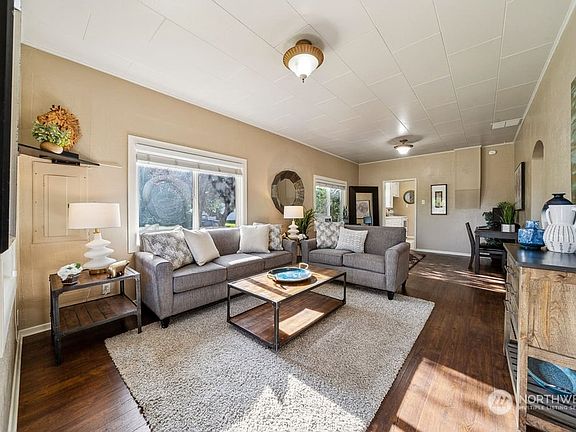 This tastefully updated 2 bedroom-1 bath home is situated on a nicely landscaped corner lot near historic downtown Enumclaw. The front porch welcomes you into the oversized living room with laminate flooring and lots of natural light. Adorable eat-in kitchen adjoins large utility/pantry room with door to the fully fenced back yard. Oversized 1 car garage with workshop space, and utility shed. Cement board siding, composition roof, vinyl windows. Close to vibrant downtown, shopping, schools, parks, hospital and commuter routes.