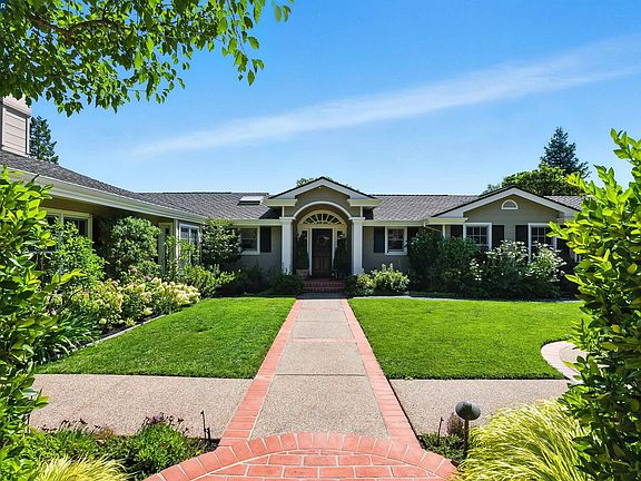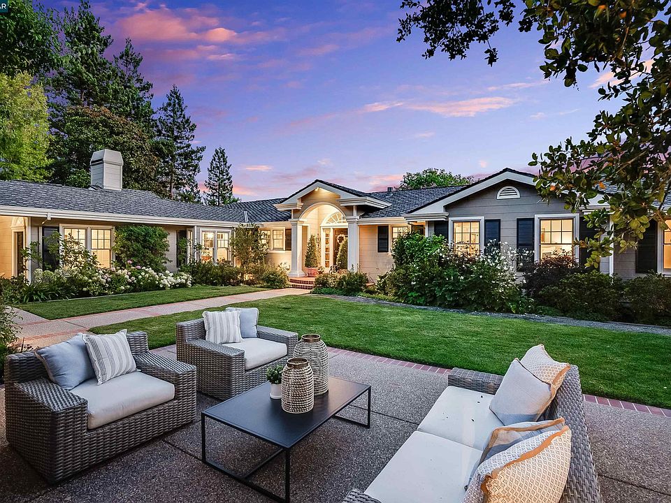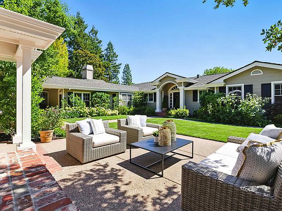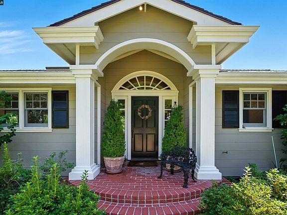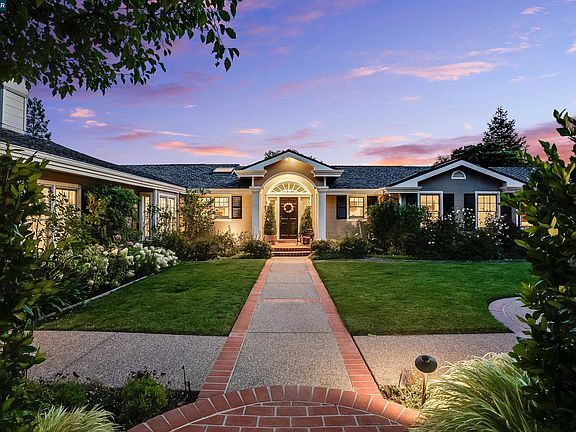 Elegant Happy Valley Estate! This beautifully updated single-level home with 4 bedrooms plus office and 3.5 baths blends timeless charm with modern luxury. Light-filled interiors feature soaring ceilings, hardwood and stone floors, and walls of windows and doors opening to private outdoor spaces. The chef’s kitchen boasts marble counters, island, and top-of-the-line stainless appliances, flowing to dining and family rooms with custom built-ins and millwork. The formal living room centers on a stunning carved fireplace. Retreat to the spacious primary suite with French doors to a private deck, dual walk-in closets, and spa-like bath with jetted tub, shower, and dual vanities. A second ensuite plus two additional bedrooms share an updated hall bath. The office includes custom built-ins and separate entrance. Outdoor living shines with a covered patio, lush landscaping, fountain, and a 350 sq ft bonus studio perfect for gym/office. Gated driveway with 3-car garage and ample parking. Moments to downtown, BART, freeway, and all K–12 top-rated schools!