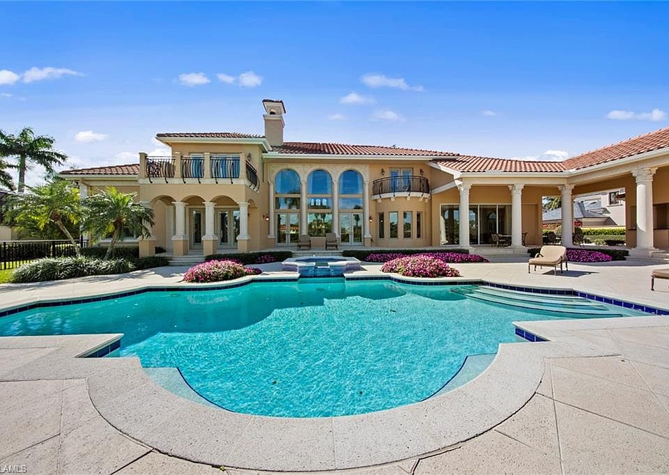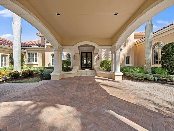 This vibrant and luxurious estate home in the very private Estates at Bay Colony Golf Club is nestled among an enclave of 75 estate homes, with membership to the exclusive Bay Colony Beach Club included. Situated on a cul-de-sac, this estate home rests on the 1st hole of the championship course and enjoys a beautiful northeastern exposure from the private backyard. The home boasts four bedrooms and a den, five full bathrooms, two half baths, formal living and dining room, spacious kitchen, outdoor kitchen, gas fireplace, detached guest suite, and spacious master suite. A three-car garage with a separate golf cart garage are accessed by the second driveway. Gorgeous landscaping throughout the property gives a colorful and extravagant feel from both the road and your lanai. Upstairs you will find 2 en-suite bedrooms, a wet bar, a second living area along with a balcony overlooking the pool, spa, and golf course!