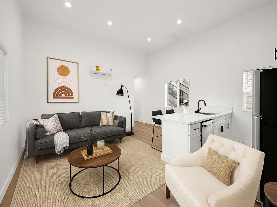 Step inside and be greeted by soaring ceilings over 10 feet tall, creating an airy and spacious atmosphere. The open-concept layout highlights a contemporary kitchen equipped with stainless steel appliances, sleek cabinetry, and plenty of counter space for cooking and entertaining.
