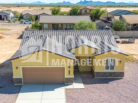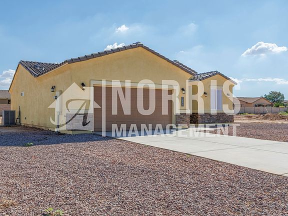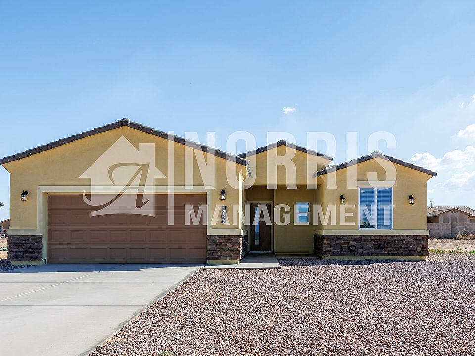 Welcome to your brand new never been lived in home in Arizona City. The home features all appliances including refrigerator, dishwasher, electric stove and microwave. Upon entering the front door you will find very clean tile flooring all throughout the home, with a big island for entertaining. This is a split floor plan with the secondary bedrooms on one side of the home with a full bathroom right off the living area. One bedroom has a door access to the outside of the home offering privacy for one of your guests. The sliding back door opens to a dirt lot with no rear yard fencing. You will need to bring your washer and electric dryer to hook up in the home. The garage holds two cars with an area for storage.