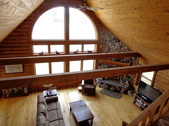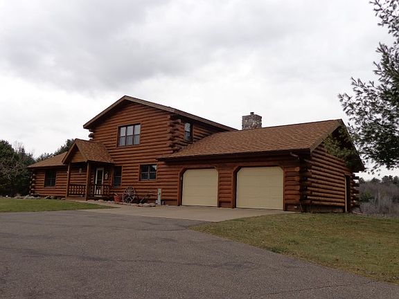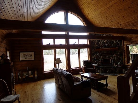 This beautiful lake front property is located in the heart of Wisconsin. It has a commanding view from the south end of spring fed Rinehart Lake; a tranquil, no wake lake in the town of New Hope, Portage County. The house is a Wisconsin Log Home constructed in 1995. Six inch exterior walls are covered with 8 inch half-log siding making this 3,600 sq. ft. home very energy efficient. The roof was stripped and re-shingled in 2007. In 2009 new carpeting was installed in the bedrooms, tile in the kitchen and linoleum in both full bathrooms and laundry. The kitchen includes a JennAire stove/oven with grill and second burner module. The efficient wood burning fireplace in the great room uses an outside air intake for combustion, thereby eliminating wasteful use of room air. Nice larger master bedroom w/walk-in closet. Large loft bedroom with own full bath. The lower level is newly carpeted with the exception of the kitchenette/dining area (new linoleum) and utility room. A nice large family room (makes a great exercise room), five closets, bedroom, new full bathroom, and two other rooms (den, crafts, hobby or play) complete this level. An additional two-story barn shaped building measuring 28'x40' includes a finished off second floor with electric baseboard heat. Both levels are insulated. It is currently used as a two car garage with a wood working shop on the ground floor. The second floor has two rooms and is used for storage, but could be turned into a large studio, bunk house for guests, playroom for grandchildren, etc. Watch from the great room or deck as Sandhill cranes, Canada geese, and ducks raise their young along the lake shore. Deer walk through the yard and an occasional wild turkey visits. Eagles soaring over the lake are not uncommon. Children will love exploring along the shoreline for a variety of frogs, tadpoles, salamanders, and turtles. Spend time watching a large mouth bass cruise by the dock or feed the bluegills bits of bread. Winter offers cross-country skiing, downhill sledding, snow shoeing, ice fishing, or just relaxing in front of the wood burning fireplace and watching the birds at your feeder. Two extra contiguous 2+ acre lots are also available at an additional cost. All lots have frontage on Rinehart Lake.