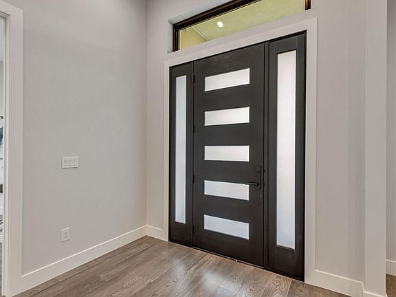 Luxury details include heated bathroom floors, quartz slab countertops, glass shower doors, hardwood and tile flooring, skylights, and wine display racks. Entertainment and comfort are built in with surround sound in the family room, speakers in the primary bedroom and living room, CAT6 outlets, central vacuum, and a dramatic 12-foot folding door leading to the patio.
