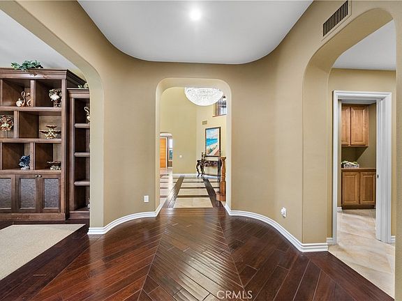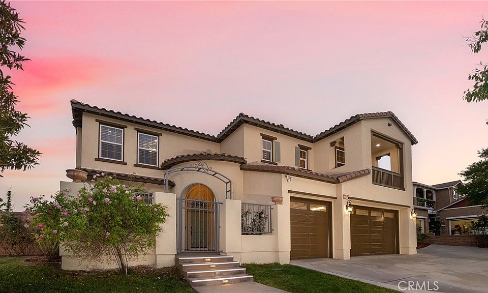 It's perfect for both entertaining and everyday living! Situated on approximately a 13,000-square-foot lot with lush landscaping including a beautiful rose garden, spectacular views abound in this gated community. A gated courtyard with a rotunda-shaped entry and a beautiful arched front door welcomes you. Engineered hardwood flooring, tile, and carpet throughout. Recessed lighting with LED bulbs surround sound music system, ceiling fans in multiple rooms, and Plantation shutters throughout for elegance and light control. Soaring ceilings in the formal living room with an elegant crystal chandelier. Formal dining room with crown molding opening to the backyard, offering amazing city light views. This kitchen is a chef's dream with an extra large center island. Plenty of cabinetry, granite countertops with bullnose edging, and a full backsplash with lighting. GE MONOGRAM stainless steel appliances include a double oven, a 4-burner cooktop with a powerful range hood, a microwave, a dishwasher, and a built-in refrigerator. The family room features built-in surround sound, recessed lighting, a fireplace, and a built-in media niche. Downstairs bedroom with an en-suite bathroom and walk-in shower. A lighted circular stairway with wrought iron spindles adds to the open and bright floor plan. The master bedroom has a double door entry, custom paint, tray ceiling, surround sound speakers, ceiling fan, and custom built-ins, plus a balcony overlooking the backyard with a gorgeous, unobstructed city lights view, the retreat area is relaxing and peaceful. Generous-sized master bathroom with dual vanities, deep, jetted soaking tub, and separate large walk-in shower, custom tile work, and an oversized walk-in closet with dual entrance. Loft with engineered wood flooring, ceiling fan, surround sound system, and a beautiful mountain view. Extra large laundry room with plenty of cabinetry, folding station, and utility sink. Nicely maintained backyard with a large concrete slab, fire pit, relaxing fountain, and custom built-in BBQ island. 3 car garage with an epoxy floor coating, double-insulated garage doors, dual openers and remotes, electric vehicle car charger, TESLA compatible. Overall, this home combines luxury and functionality with its spacious layout, high-end finishes, and breathtaking views from various vantage points.