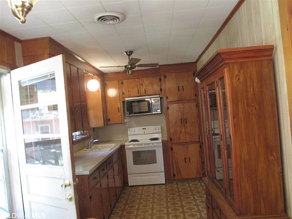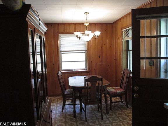 This home has a very nice large oak tree in the front yard providing shade over a 10 x 16 ft. porch with swing, very large azaleas & camellias in the yard, large chain link back yard has a very large sycamore tree, 2 large FIG TREES,Magnolia tree & other shrubs. The back entry is equipped with a handicap walk way. The garage is very large,with a covered shed on the left side & the entire back of the garage has a covered shed. The garage has a gas space heater,gas stove.window A.C. & 50 Amp electrical service. The hardwood floors in the home are the Original Hardwood floors, could be refinished very beautifully. Elberta is a great place small town atmosphere, home of the Elberta Sausage Festival twice a year,just a short 20 minute drive to the beaches & 10 minutes to the Tanger Mall shopping 0R 15 minutes to grocery stores & the Hospital