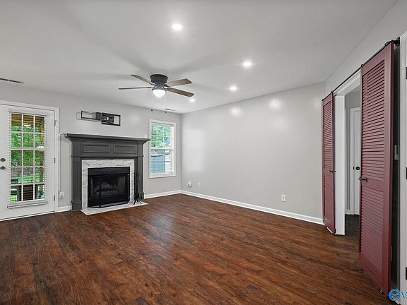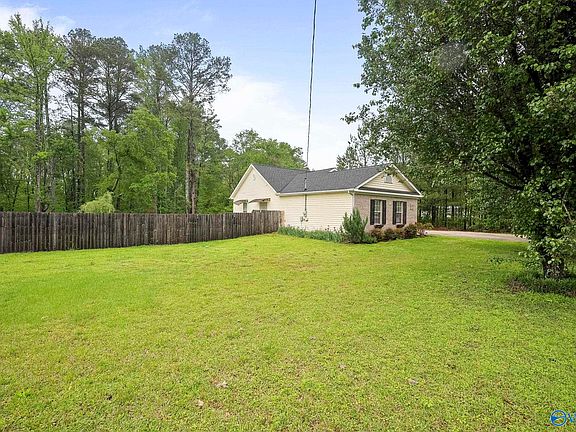 Just minutes from Huntsville or Lake Guntersville, this home boasts a large living area with wood burning fireplace and isolated master bedroom w/vaulted ceiling, private bath and walk-in closet. The kitchen has stainless steel appliances, updated counter tops and cabinets. Brick and low maintenance vinyl siding, smooth ceilings, energy efficient windows. Situated on a 2 acre partially wooded lot with fenced back yard, ideal for a garden or kids play area. Detached workshop w/electricity and a covered parking pad. HVAC and Roof were both replaced in 2023. Rare opportunity in Owens Cross Roads under 300k with 2 acres that leave endless possibilities.