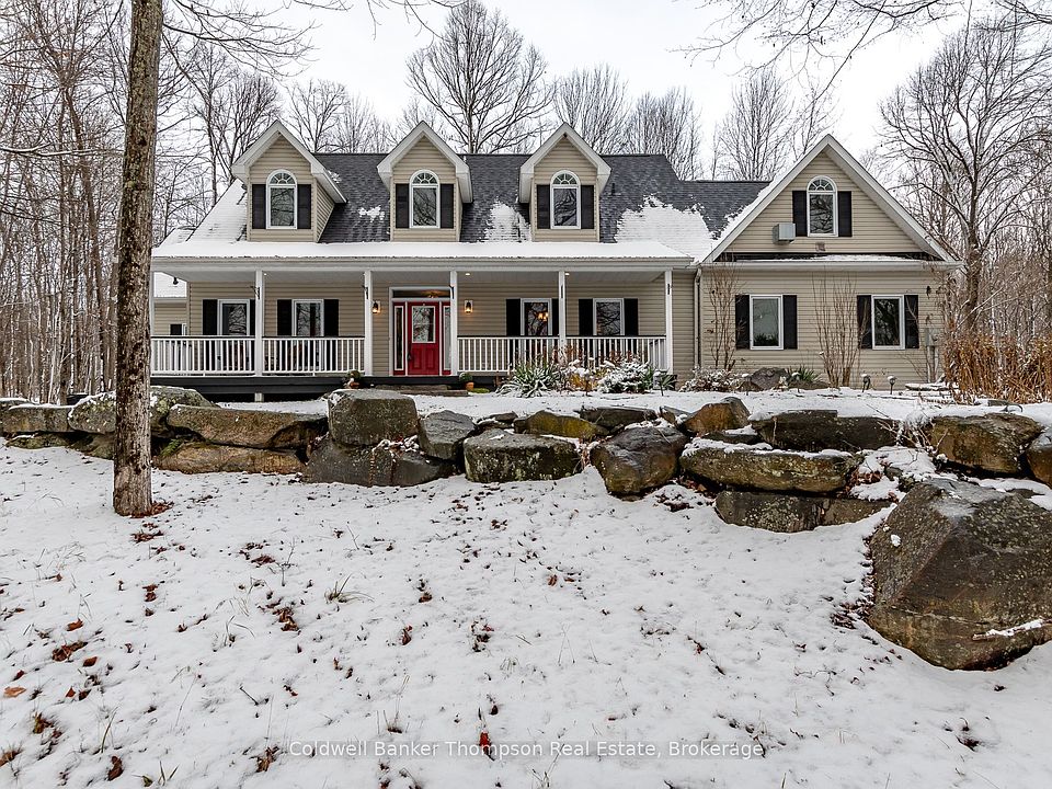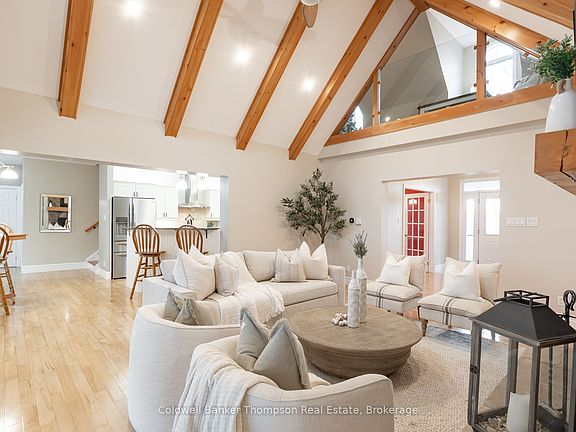 At the end of a quiet cul-de-sac, a meandering driveway leads through the trees to a stately home, accented by a covered front porch & classic dormer windows. Inside the spacious foyer, the formal dining room sits to the right, while the living room opens ahead, featuring a stone-accented wood-burning fireplace & a vaulted ceiling with faux wood beams. The kitchen offers granite counters, a propane cooktop, a built-in raised oven & microwave, & ample cabinetry, perfect for everyday cooking & entertaining. From the living room, two separate hallways extend to the guest bedrooms, creating excellent privacy. One hallway leads to a guest suite with a walk-in closet & 4pc ensuite. The other hallway connects to a second bedroom with an adjacent 3pc bathroom & a nearby den, ideal for quiet work or reading. On the opposite side of the main floor, the large primary suite feels like its own retreat, complete with a walk-in closet, faux-beam-accented vaulted ceilings, & a 5pc ensuite featuring a jetted soaker tub, shower stall, water closet, & double-sink vanity. Upstairs, the family room, with its propane fireplace, offers a comfortable gathering space, complemented by a convenient 2pc powder room. Beyond this, a generous open area is currently arranged as two separate office spaces, perfect for work-from-home flexibility or creative pursuits. Bell Fibre is installed at the property, providing excellent connectivity. Outdoors, the property enjoys private, deeded access to Peninsula Lake, shared with only two neighbouring properties, via a private, cleared hiking trail. The trail leads to a hard-packed sand entry & a private dock, offering a simple, convenient spot to launch a canoe or kayak, or even to dock your boat. The northeast boundary of this property adjoins the protected Pen Lake Farms Nature Reserve, creating a peaceful natural buffer & enhancing the quiet surroundings. This home offers thoughtful design, privacy, & a rare opportunity for private waterfront access.