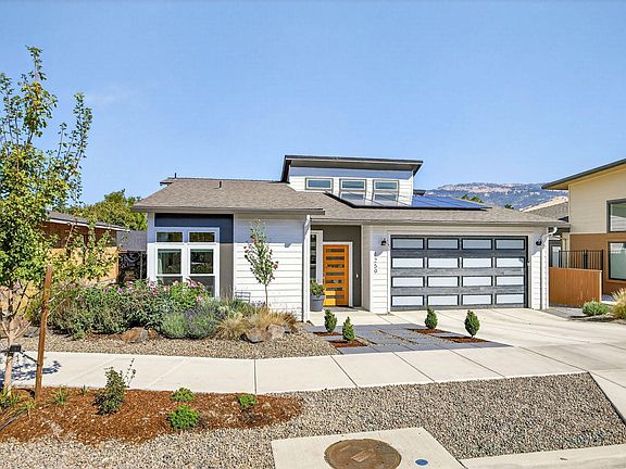 Welcome Home! This eco-conscious contemporary gem features fully-owned solar panels with net-zero offset, energy-efficient materials, ductless heating/air, and heat pump water heating. Earth Advantage Premium and Firewise Certified! The open floor plan is bathed in natural light with vaulted ceilings in the kitchen, living, dining, and primary bedroom. Kitchen highlights include a waterfall island, stainless steel appliances, induction cooktop, apron sink, and ample cabinetry. A split layout ensures privacy across three bedrooms. The primary suite offers dual vanities, tiled shower, walk-in closet, and side porch access. Durable vinyl plank/tile flooring and custom cellular blinds throughout. Enjoy the large private deck and low-maintenance landscaping. Two-car garage with extra storage. Located in Beach Creek Community with tree-lined streets, flowered promenade, garden space, and easy access to bike paths, parks, and downtown Ashland.