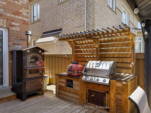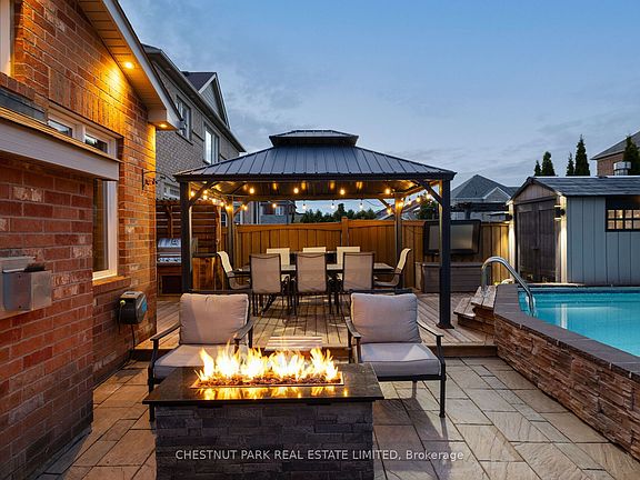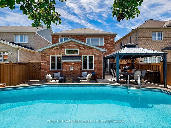 An Entertainers Dream Home! Serious WOW factor! This home is a showstopper and a must see!! Over $150,000 spent in quality upgrades throughout. Owned by one family since 2010, a true sense of pride of ownership is evident from the moment you see the stunning 2 storey exterior stone & brick facade. Set on a wide 36.09x114.83 foot south-facing lot with 4 bedrooms & 3 baths. Many thoughtful expensive upgrades throughout, see extensive list for all the details! Built by the renowned Great Gulf homes, this home boasts the Primrose model a much preferred layout. If you are looking for your forever family home well look no further! This is more than a home - it's a place to grow, connect, and create lasting memories. An outdoor playground for all ages your guests will never want to leave! No need for a cottage when you can relax with family & friends in the stunning outdoor oasis. Gorgeous 15x25 full-sized heated elevated in-ground salt water pool with cabana & a 2-piece bath. Custom built-in BBQ center with Napoleon built-in grill & a Kamado charcoal grill/smoker with granite countertop. Large patio with a 10x12 steel coated gazebo for al fresco dining. Separate seating area for after dinner drinks or a tranquil spot to enjoy your morning cup of coffee (perfect for all 4 seasons). A chefs dream kitchen! The true heart & hub of the home! The large modern renovated kitchen will entice any chef to get cooking with a walk-out to the backyard. A HUGE 10' Centre Island with granite countertops, with a built-in beverage fridge, ample storage & electrical outlets with USB charging on both ends of the Island. Maple cabinetry, Caesar stone countertops, Full height 2 door pantry & Calcutta white marble backsplash. The family room features a gas fireplace, Cathedral ceilings, with a home theatre like no other! High Definition HDMI rear wall mounted projector with a custom ceiling hide-away enclosure, rear in-wall & front wall mounted speakers Great space for family movie nights!