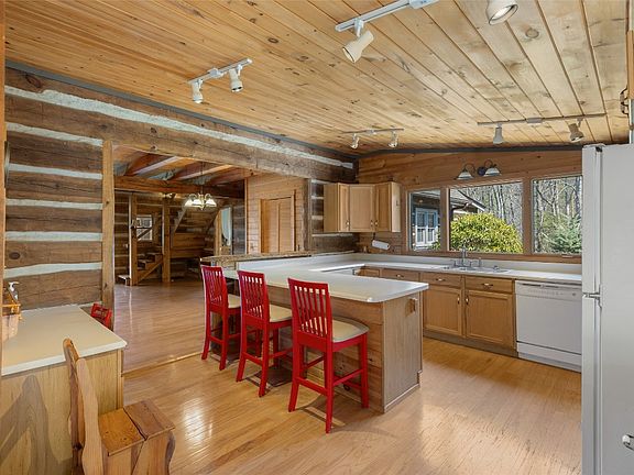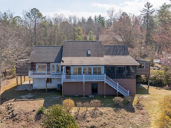 One of the nicest subdivisions in Scaly Mountain is Rocky Knob, featuring a 17-acre spring-fed lake and gated entry. This log cabin was built in the 80's and added onto. The light and bright kitchen has room to eat-in, but a separate dining area is part of the living room. Outside the living room is a glassed-in porch featuring a beautiful mountain view. The primary bedroom features his and hers bathrooms as well as a huge walk-in closet. On the other side of the home is another bedroom, bath, and kitchen, which can serve as an apartment with separate entrance. Upstairs is a large office area with half-bath and sleeping quarters on each side of it. Downstairs, separate entrance, is a huge basement where you can store all sorts of things. The lot is lovely and private and is almost 2 acres, featuring a great rock for picnicking. This home has been loved and honored by its owners for many years. There is a 30-day restriction on rentals.