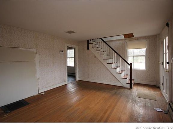 Circa 1851 this 1826 sq ft colonial is situated on a tranquil, wooded 1.93 Acre lot surrounded by stone walls, babbling brook and backs up to the Meshomasic State Forest. Many original features preserved in this Post and Beam farmhouse. Original Beehive of Wide pine floors and pantry with built ins. The first floor features a huge kitchen, dining area with wood stove, remodeled bath, laundry room and generous size living room. The second floor features 4 bedrooms and a full bath. 2 staircases and a walk up attic! Short trip to Middletown/Hartford. Amazing potential for investment or live-in/fix up! Come look!