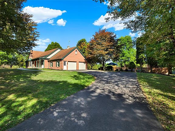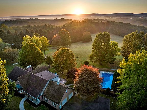Amazing Laurel Sunrises! 4 BR 3-1/2 bath (22) acre Estate! Private back patio adjoins Kitchen & Great Room. Wildlife abounds - a bird sanctuary. Bluebird boxes await the next season! Garden areas w Gazebo. Several outer yard faucets to water plants & flowers. Heated 22 x42 Salt Water Swimming Pool w beautiful fenced in patio & lawn. Lit Bocci Court & Horseshoe Pits. Large Eat-In Kitchen w Island, 2 sinks, and loads of cabinets. First floor Laundry with pantry cupboard. Primary Bedroom Suite w walk-in closet, wood-burning Fireplace, private Eastern Patio, spacious shower, private water closet, soaking tub double vanity await! Abundant sunlight in the 20x26 Great Room w dining area built in & huge wood-burning Fireplace. Natural Stone floor Entry Foyer leads to handsome Den/Office and 1/2 bath. Fully finished basement w Family Room, pellet stove, full Bath, large Bedroom w walk-in closet. Oversized 2 car garage w work bench. Detached 3 car Barn/Garage w 1/2 Bath. Home Warranty!