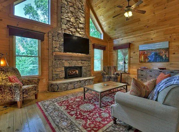 This chalet-style cabin is offered turnkey with mountain views! It's situated in Mineral Springs Ridge which offers a walking trail and park conveniently located only a few minutes from downtown Blue Ridge! Open vaulted ceilings, two fireplaces (one exterior), covered wrap-around porch with ample sitting areas to take in the peaceful surroundings. Hardwood floors, custom pine cabinetry, granite countertops in kitchen and baths, stainless steel appliances, and custom window treatments. This craftsman cabin offers a private setting with a hot tub and firepit area. This successful short-term rental has two bedrooms and two bathrooms with easy access all paved roads to the property. The spacious living room has vaulted ceilings and a gas fireplace. The fully equipped kitchen includes a breakfast bar and an adjacent dining room. The main level bedroom has French doors leading to the porch for enjoying the scenic surroundings. The upper-level bedroom boasts a king-size bed and an en suite bathroom with a walk-in shower. French doors lead to a private balcony where mountain views can be savored. The cabin's porches and interior stairs are customized with mountain laurel. Lower porch wraps around three sides of the cabin and offers a beautiful outdoor rock wood-burning fireplace,. Soak in the hot tub after a day of hiking, and enjoy smores over the cozy fire pit. Outdoor living galore for relaxation and entertainment. Includes walk in crawl space for storing kayaks and other toys! Come take a look for yourself, you won't be disappointed!
