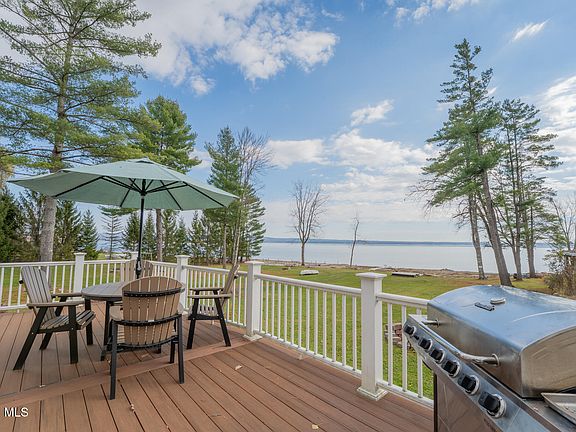 Wood burning fireplace insertDirect waterfront homeExpansive water viewsLakeside deckLevel yard and beachVaulted ceilingsSolid wood doors