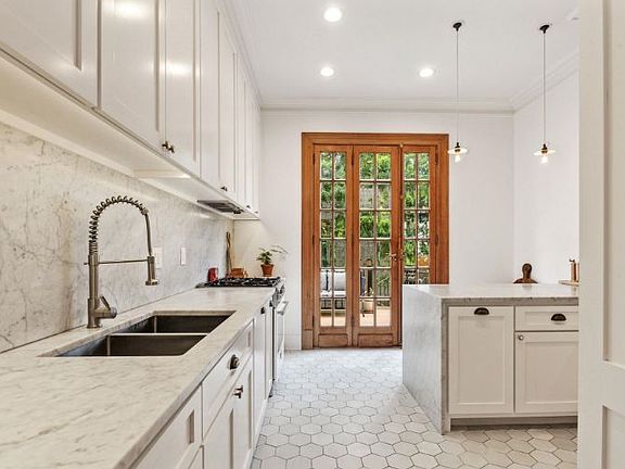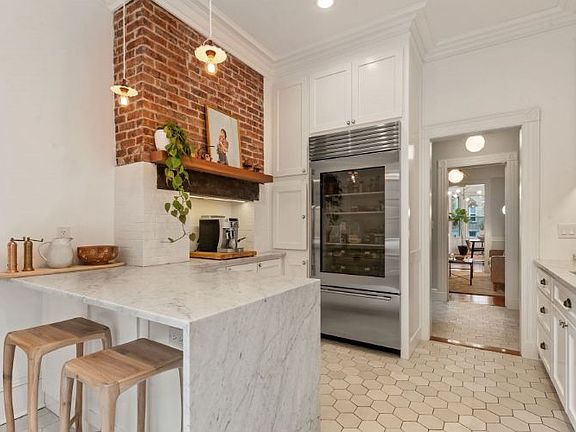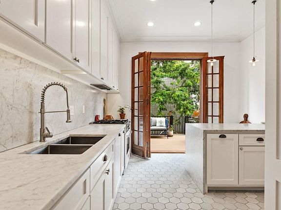 Historic Charm meets Modern Chic in this spectacularly renovated townhouse. Past double parlors with antique pocket doors, your gorgeous kitchen is a chefs dream! Marble counters continue onto your backsplash and waterfall peninsula. Custom ceiling height cabinets allow ample storage, while a Bertazzoni stove and Sub Zero refrigerator let you prep in style. 19th century French doors open to a terrace and large backyard oasis. The garden level offers a perfect work from home office, guest or play area and a large laundry room. Enjoy beautifully renovated baths, WIC, central air + too many extras to list here! Just steps to 24 hour New York City Transport, Downtown Jersey City nightlife and the Hilltop neighborhood's thriving art scene. Welcome home!