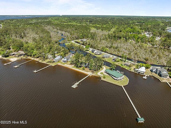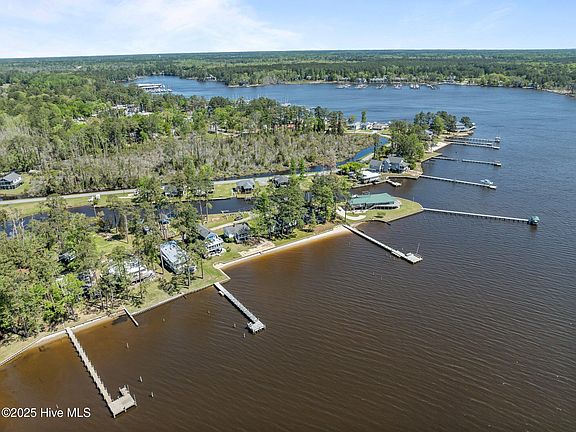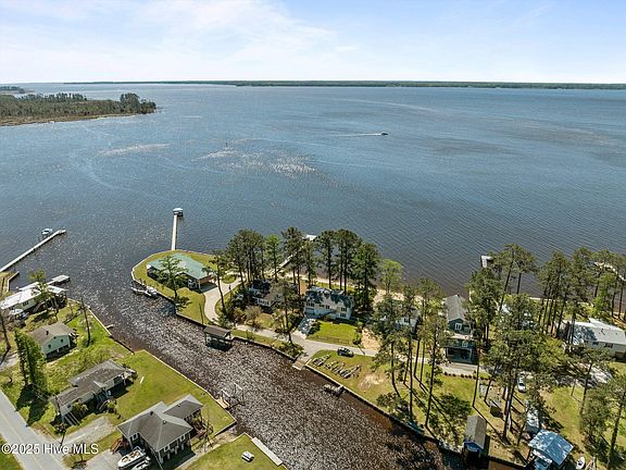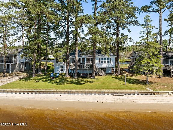 Character and comfort define this sweet mid-century waterfront cottage with location and river views to die for! This compact home lives large, with great features including a practical split floorplan with just-carpeted primary bedroom with walk-in closet and en-suite bath on one side, and two additional bedrooms on the other. Central is a cozy knotty-pine den with woodburning fireplace and center hall with second full bath and entry to the screened porch and deck. The kitchen with eat-in bar leads to a dedicated dining room with built-ins, big enough for everyone to gather for fun evenings of friends-and-family dinners or games. You'll love the large screened porch and deck overlooking the wide waters of the Pamlico River! There's storage room to spare with numerous closets and enclosed space under the house. Step outside to a large, nicely -landscaped yard and newer bulkhead, and a private sandy beach. Perfectly-sized for a weekend getaway or seasonal home, and a solid history as a short-term rental. If you're looking for affordable and comfortable waterfront this gem checks the boxes. Summer is coming - it won't last long.