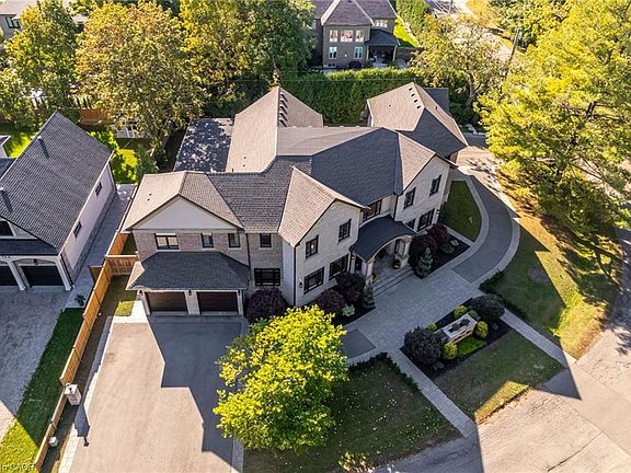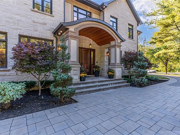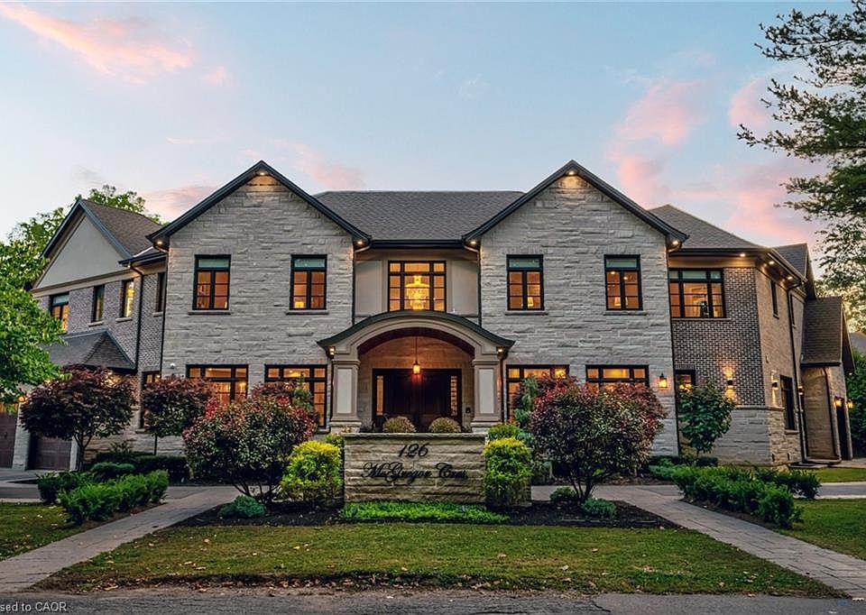 This multi-generational luxury dream home blends timeless design with superior craftsmanship, offering over 8,850 sqft. of finished living space with 7 bedrooms and 8 bathrooms on a 135-ft-wide lot in Ancaster’s prestigious Oakhill neighbourhood. Surrounded by mature trees and estate homes, the property showcases two separate garages, parking for 20+ vehicles, professional landscaping, and a commanding architectural façade. Inside, a 21-ft grand foyer with curved staircase and custom millwork sets an elegant tone, complemented by wide-plank hardwood, porcelain tile, and abundant natural light from oversized windows. The main level offers formal living and dining rooms, a private office, powder room, and one of two primary suites with backyard walk-out. At the heart of the home, a soaring family room with floor-to-ceiling windows connects to a gourmet kitchen featuring top-tier Thermador appliances, a servery, walk-in pantry, and a heated four-season sunroom with in-floor heating. Upstairs are four generous bedrooms, each with its own ensuite and heated floors, plus a convenient laundry room and a spectacular primary retreat with gas fireplace, dressing room, and spa-inspired 6-pc ensuite. A covered terrace with artificial turf extends the living space outdoors. The finished lower level offers incredible versatility for extended family living with a separate entrance, two bedrooms, two bathrooms, recreation room with gas fireplace, kitchenette, and a sound-isolated home theatre room that can be separated from the rest of the basement. The private backyard provides multiple patios under mature trees, with professional renderings available for a future pool, hot tub, and full landscaping. Smart-home features include Control4 automation, security system, 400-amp, dual furnaces & ACs, HRVs, and central vacuum with hide-a-hoses. A rare opportunity to own an Oakhill estate that combines sophistication, space, and modern functionality for today’s luxury lifestyle.