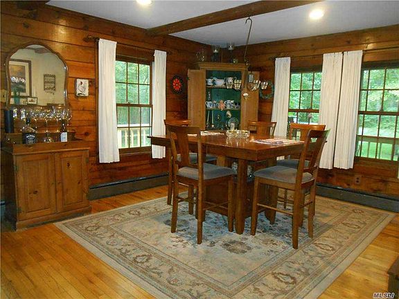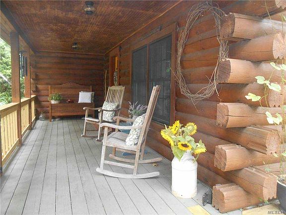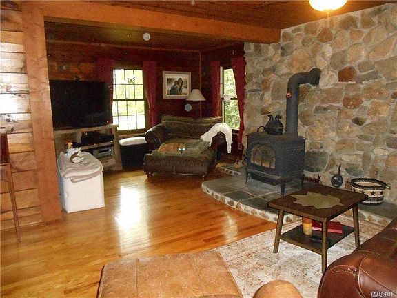Cape style Log Home with hardwood floors Air Tight Wood burning stove. The front porch wraps around the side, opening up to a huge New deck overlooking a panoramic view of the expansive 1/2 acre yard. The yard features large gardens, Hot Tub, Greenhouse & a small frog pond (with waterfall). The 2nd floor features 2 bedrooms with walk-in closets and full bath. The basement adds extended living area with full Bar area, gym & Laundry. Many updates.