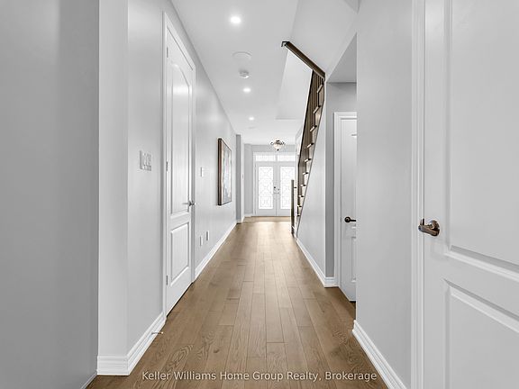 This beautifully upgraded 3-bedroom, 3-bathroom freehold end-unit townhome by Fernbrook is located in the highly desirable Rockwell Estates of Rockwood. With outstanding curb appeal and uninterrupted views of Rockmosa Park, this home offers both style and comfort for growing families or those ready to move up from condo living. The open-concept main floor boasts 9-foot ceilings, oversized doors, upgraded millwork, surround sound, and gleaming quarter-sawn white oak hardwood. A stylish kitchen features a large center island, quartz countertops, exceptional cabinetry, and top-of-the-line WiFi enabled LG black stainless appliances perfect for family living and entertaining. Upstairs, the spacious principal bedroom offers a stunning custom walk-in closet and a spa-like ensuite with heated floors, a soaker tub, and a frameless glass shower. The second-floor laundry with premium washer, dryer, and cabinetry adds everyday convenience. Additional upgrades include 9 foot ceilings in the lower level, an oak staircase with custom banisters, upgraded bathroom cabinetry, a garage outfitted with double loft storage, epoxy floors, and an EV charging station. The lower level is ready for finishing with oversized windows, rough-in for a bathroom, and upgraded insulation ideal for creating a playroom, home office, or rec space. Families will love the community, with walking trails, Rockwood Conservation, Rockmosa Park, soccer and tennis courts, pickleball, a dog park, library, schools, and the YMCA Early-ON Learning Center all nearby. Commuters benefit from quick access to Guelph, Highway 7, GO Transit, and the airport. This one-of-a-kind home combines modern design, premium upgrades, and a family-friendly community an exceptional opportunity in Rockwood.