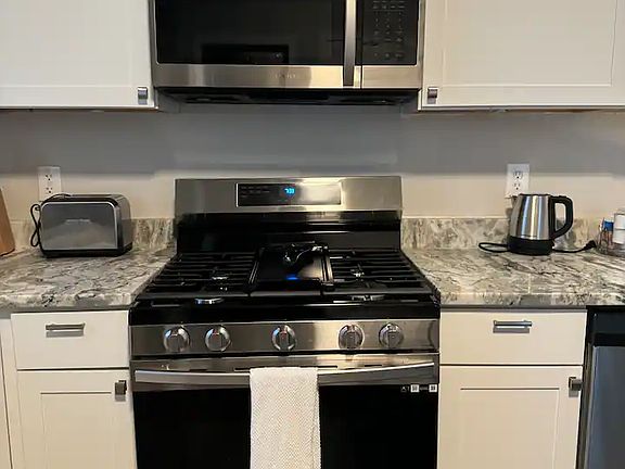 Brand new stainless appliances: washer, dryer, full size gas stove, refrigerator, microwave.