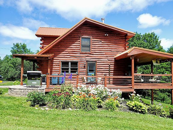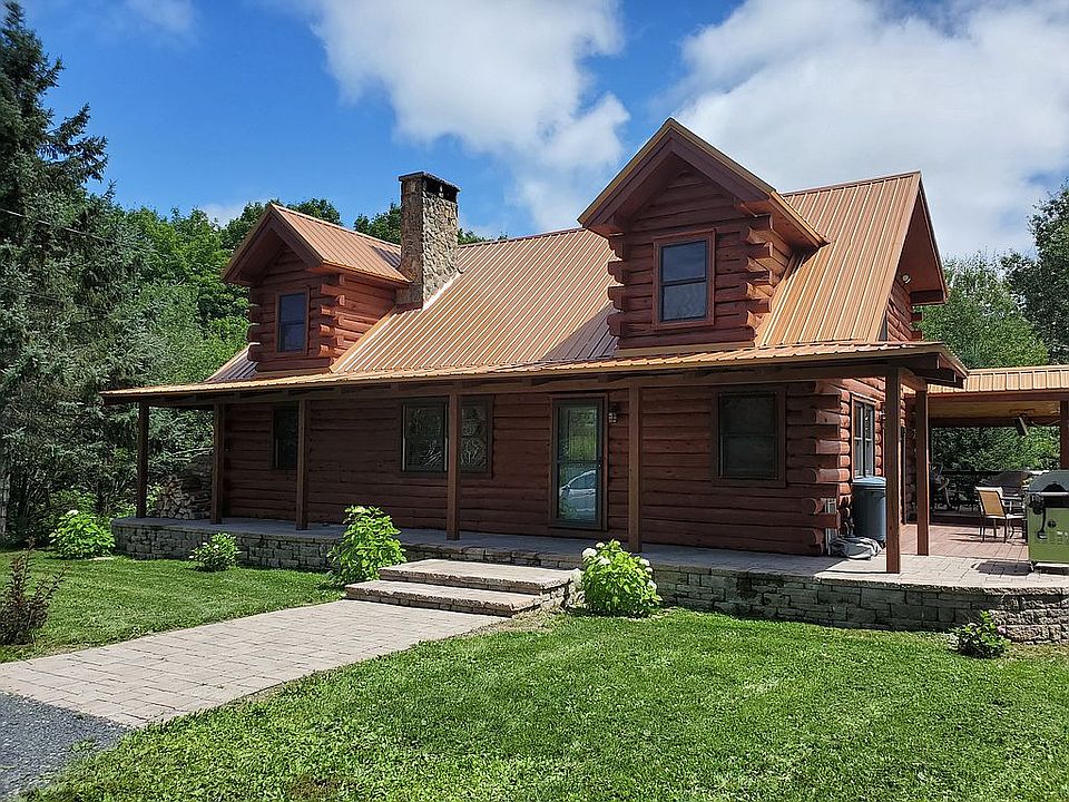 Authentic log cabin on 43 wooded acres just 4 miles to town! This is a truly unique property, as the cabin is nestled down a long driveway in a very private, park-like setting. The cabin offers 4 bedrooms and 2 ½ baths on three levels. There is a gorgeous two-story stone fireplace with a blower for heat, as well as a wood burning stove in the basement, 2 heat pumps (kitchen and master bedroom) and a Sweet Heart old fashioned stove, which limits reliance on oil to heat the home. The owners had the cabin hand-sanded, re-chinked and stained in 2019 and added the paver porch and walkway at the front of the home in 2019 - $55,000 in exterior updates! Owners are willing to negotiate the majority of furnishings with the sale of the home.